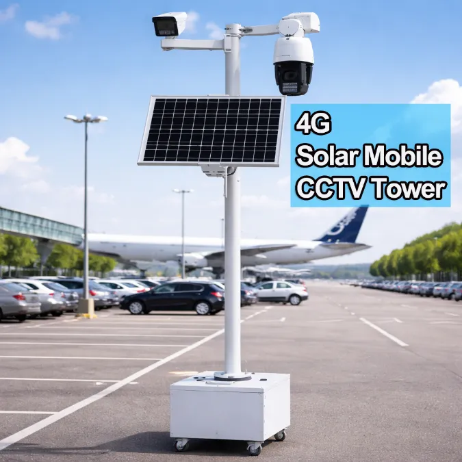 A portable solar-powered surveillance system with PTZ security cameras, 4G remote monitoring, and battery storage. Ideal for construction sites, parking lots, and temporary security monitoring.