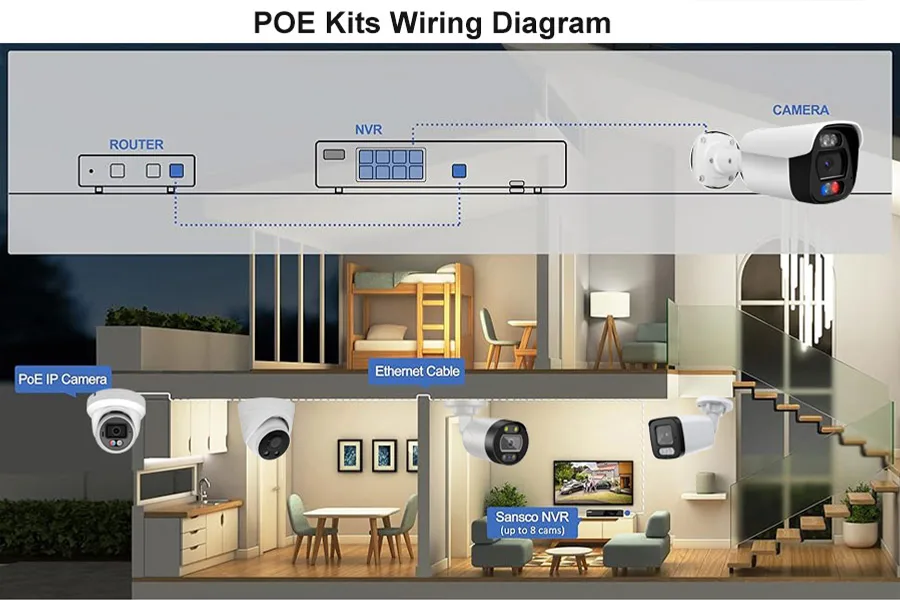 La conexión PoE le permite vincular la cámara a la grabadora de video en red a través de cables de red para alimentación, video y conexión a Internet, sin cables de alimentación para las cámaras.