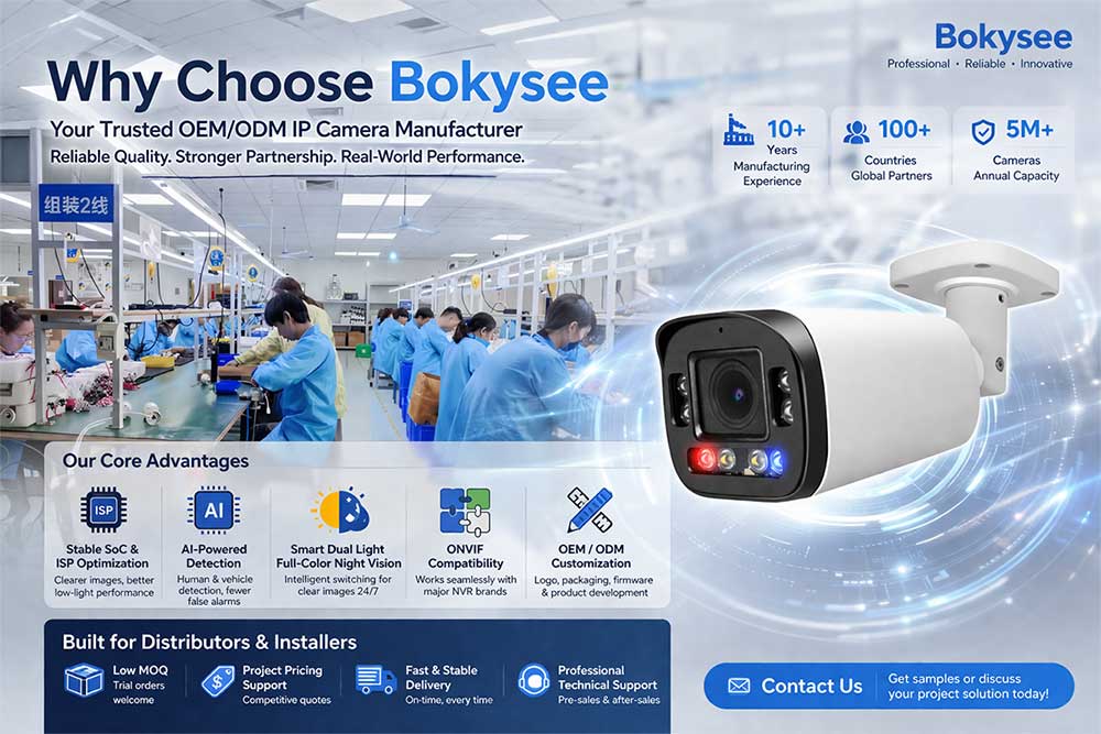 Looking for a reliable IP security camera supplier? Contact Bokysee today to get tailored solutions, stable quality, and competitive factory pricing for your projects.