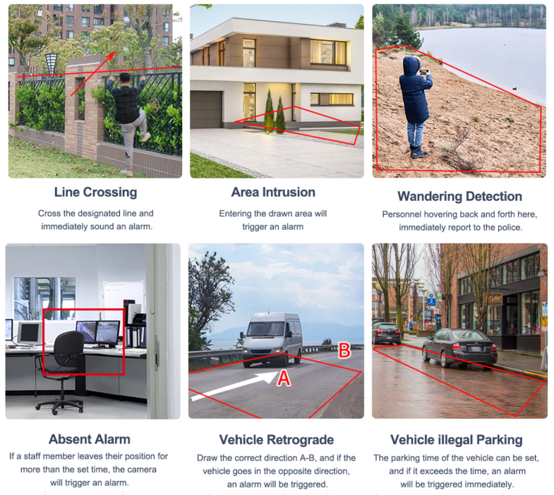 Clear image quality, smart motion detection, remote monitoring, flexible installation (PoE, WiFi, 4G). |