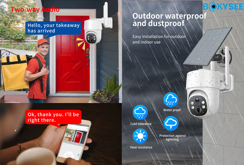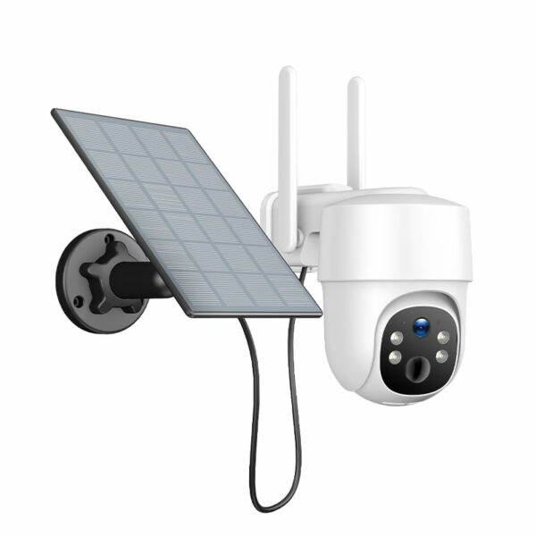 This solar-powered wireless PTZ camera offers AI human detection, PIR sensors, and two-way audio. Equipped with an HD lens, 15-20M night vision, and H.265 compression, it ensures reliable security. Powered by a 3W solar panel and a 5200mAh rechargeable battery, it supports 128GB TF card and cloud storage for outdoor monitoring.