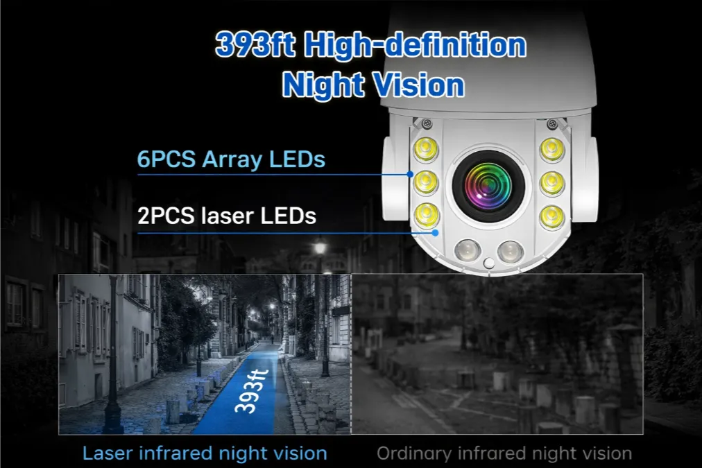 Equipped with powerful infrared night vision up to 120 meters, this outdoor PTZ security camera ensures clear images in low-light or complete darkness for reliable 24/7 surveillance.