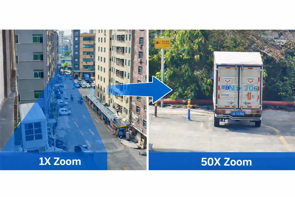 Powerful 20X–50X zoom PTZ camera enables long-distance surveillance and detailed object identification. Ideal for city surveillance, industrial monitoring, and large outdoor security projects.