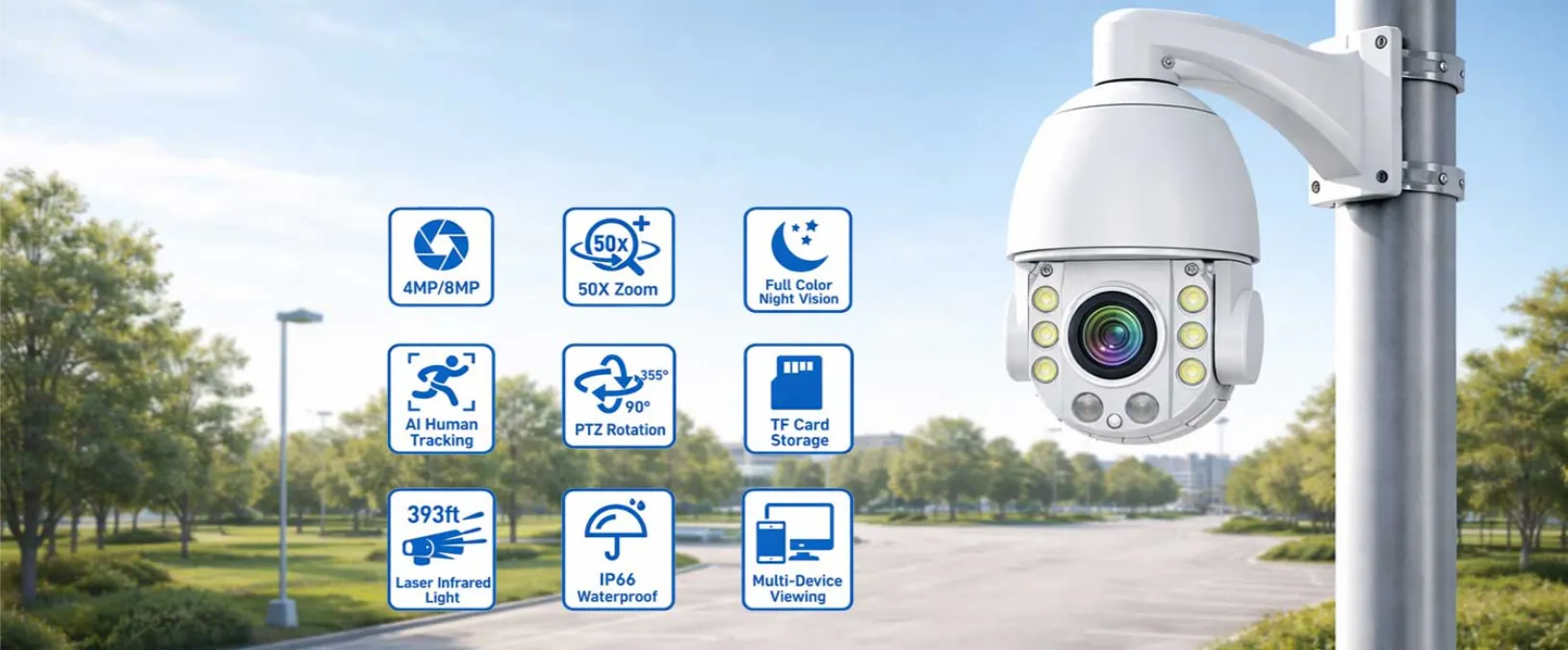 Capture crystal-clear surveillance with a 4K 8MP PTZ security camera, delivering ultra-high-definition video for precise monitoring of large areas such as parking lots, streets, warehouses, and commercial buildings.