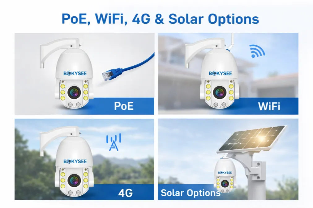 PTZ security cameras provide flexible surveillance with pan, tilt, and optical zoom control. Compared with fixed cameras, PTZ cameras can monitor larger areas and capture clear details, making them ideal for parking lots, warehouses, industrial sites, and commercial security projects. Bokysee offers a range of PTZ IP cameras, including WiFi PTZ, PoE PTZ, 4G PTZ, and solar PTZ cameras. With features like AI detection, auto tracking, night vision, and remote monitoring, they are widely used by installers, distributors, and security integrators worldwide.