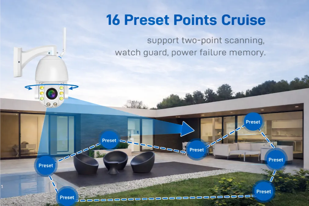 Supports 16 preset patrol points for automated security monitoring. The PTZ camera can automatically cruise between key locations, improving efficiency for large-area surveillance systems.